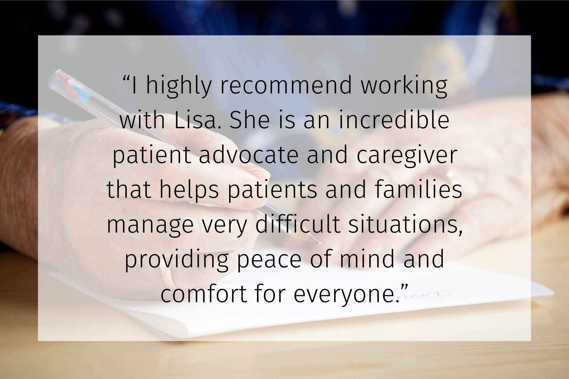 “I highly recommend working with Lisa. She is an incredible patient advocate and caregiver that helps patients and families manage very difficult situations, providing peace of mind and comfort for everyone.”